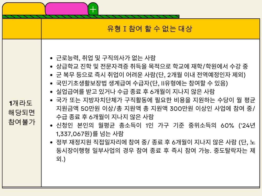 ▶ 정부 재정지원 직접일자리에 참여 중/ 종료 후 6개월이 지나지 않은 사람 (단, 노동시장이행형 일부사업의 경우 참여 종료 후 즉시 참여 가능. 중도탈락자는 제외)