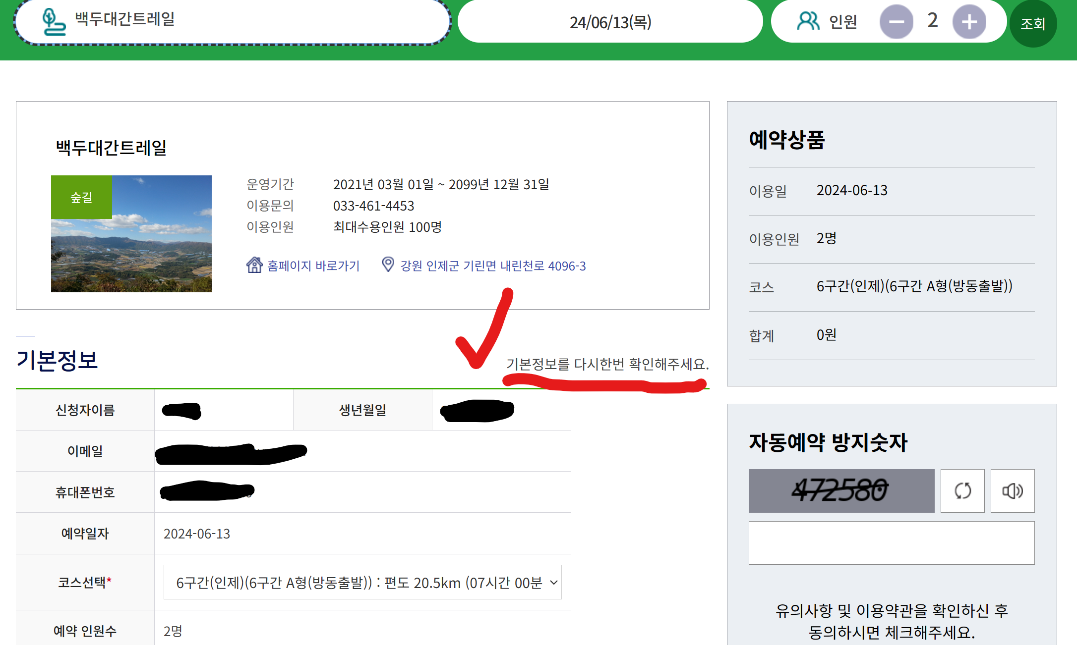 이용 날짜, 예약 인원 등 입력한 정보가 정확한지 다시 한번 확인합니다.