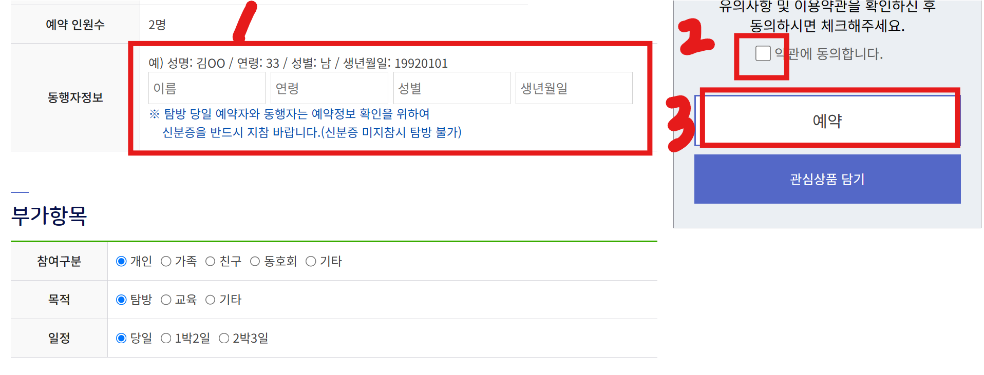 동행자가 있다면 정보를 정확히 입력해주세요. 그리고 이용사항에 동의한 후 [예약]버튼을 누르면 끝납니다. 일단 상품을 넣어두었다가 나중에 예약을 완료하고 싶다면, 파란색 버튼을 눌러 관심상품 담기에 넣어 두셔도 됩니다.