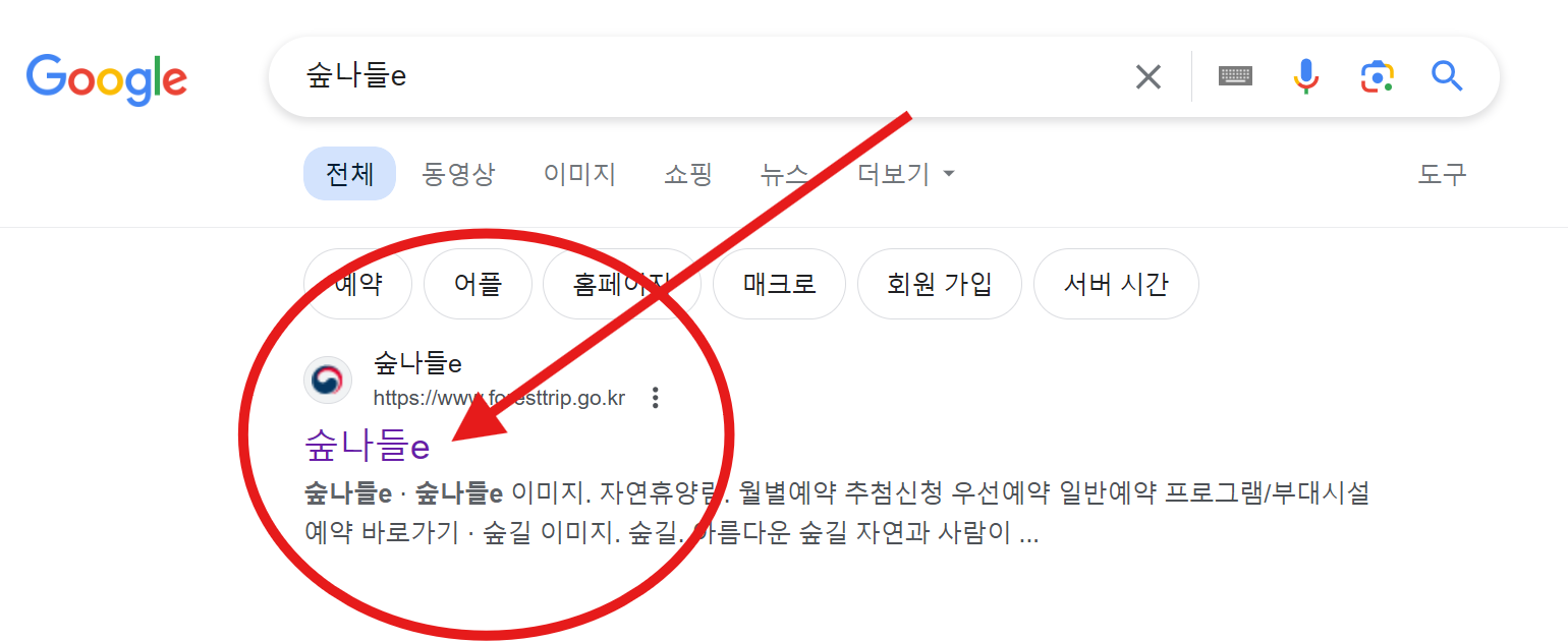 검색창에 "숲나들e " 또는 "숲나들이"라고 한글로 입력하시면 홈페이지가 검색됩니다. 클릭하시면 바로 연결됩니다.