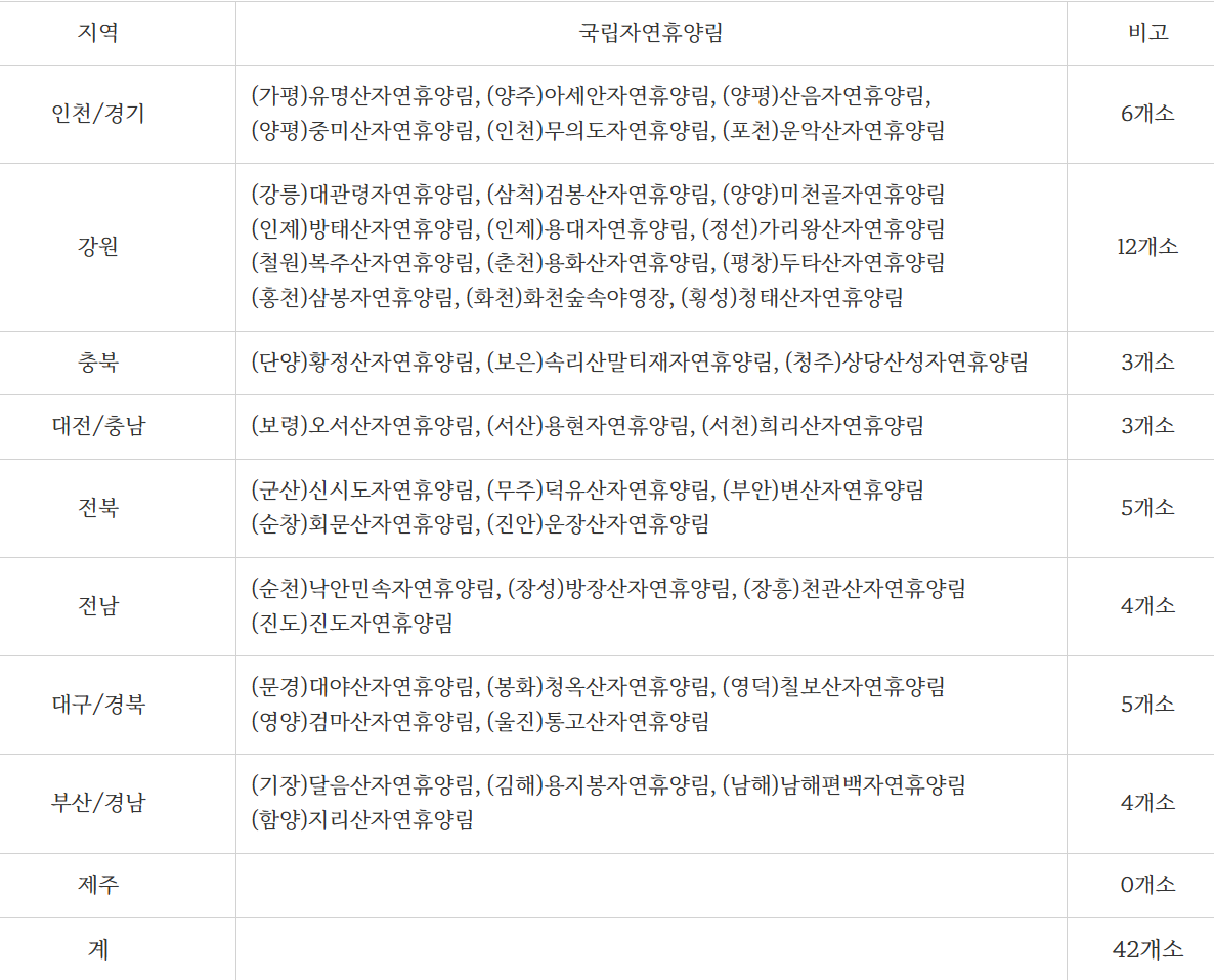 가입이 완료되면 아래 42개소 국립자연휴양림을 이용하실 수 있습니다. 이 외에도 여러 군데의 민간 자연휴양림도 함께 확인하실 수 있으니 홈페이지에 방문에 보시기 바랍니다. 아래 버튼을 통해 바로 해당 내용으로 이동하실 수 있습니다.