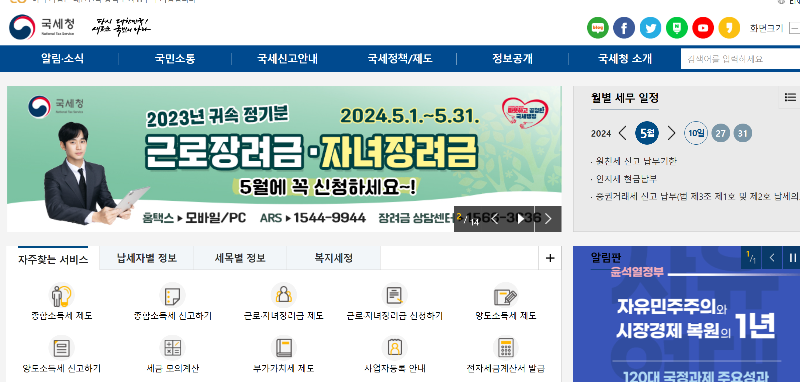 즉, 아래와 같은 "국세청" 홈페이지가 나오면 왼쪽 아래 쯤 위치한 "종합소득세 신고하기" 를 클릭해야만 종합소득세 신고방법을 실행할 수 있습니다.