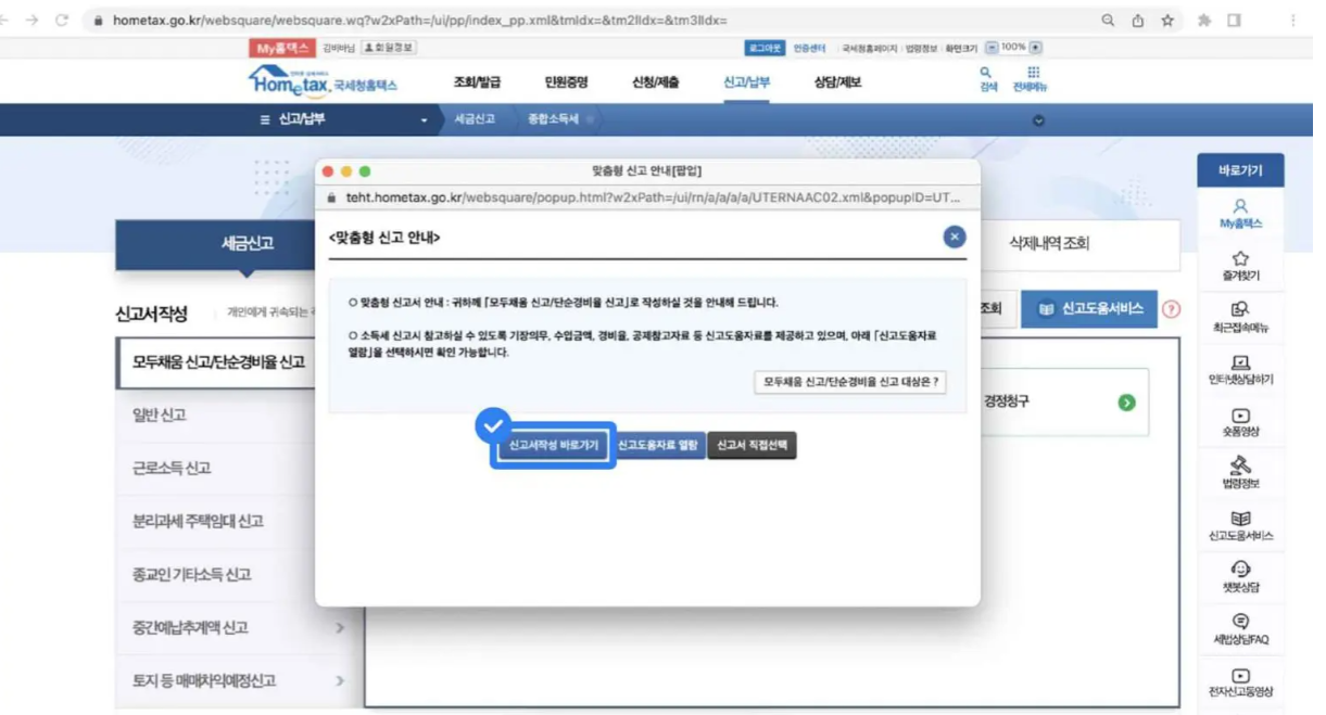 step 2. 맞춤형 신고 안내 팝업이 뜨면 '신고서작성 바로가기' 버튼 클릭