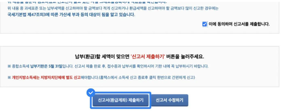 step5. '이에 동의하여 신고서를 제출합니다.' 체크 후, '신고서(환급계좌) 제출하기' 버튼 클릭