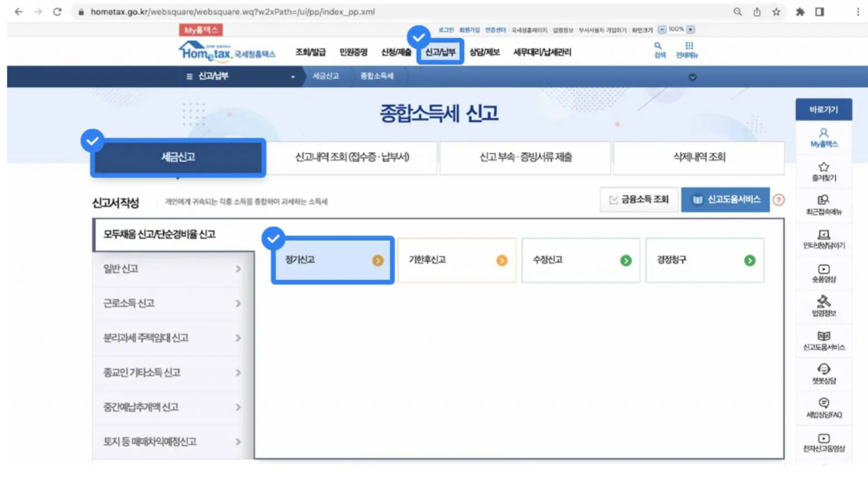 Step1. 홈택스 접속 후 [신고/납부] - [세금신고 : 종합소득세] - [세금신고] - [정기신고] 접속하기